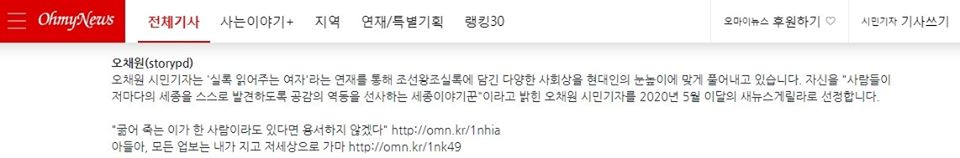 오채원 시민기자는 <실록 읽어주는 여자>라는 연재를 통해 조선왕조실록에 담긴 다양한 사회상을 현대인의 눈높이에 맞게 풀어내고 있습니다. 자신을 "사람들이 저마다의 세종을 스스로 발견하도록 공감의 역동을 선사하는 세종이야기꾼"이라고 밝힌 오채원 시민기자를 2020년 5월 이달의 새뉴스게릴라로 선정합니다.